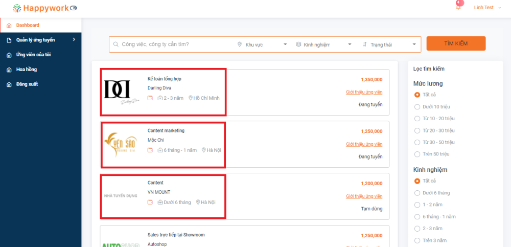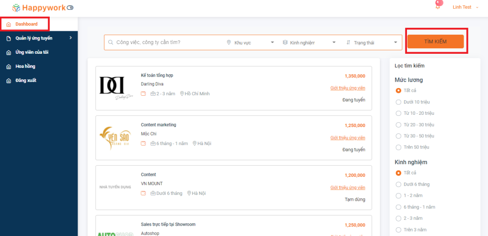 - Các bạn hãy bấm vào menu Dashboard sau đó sử dụng thanh tìm kiếm/lọc thông tin theo các trường như: Tên công việc/ công ty; Khu vực đang tuyển; Kinh nghiệm; Trạng thái công việc; Mức lương; Tag,... để tìm được job tuyển dụng phù hợp với sở trường nhé.