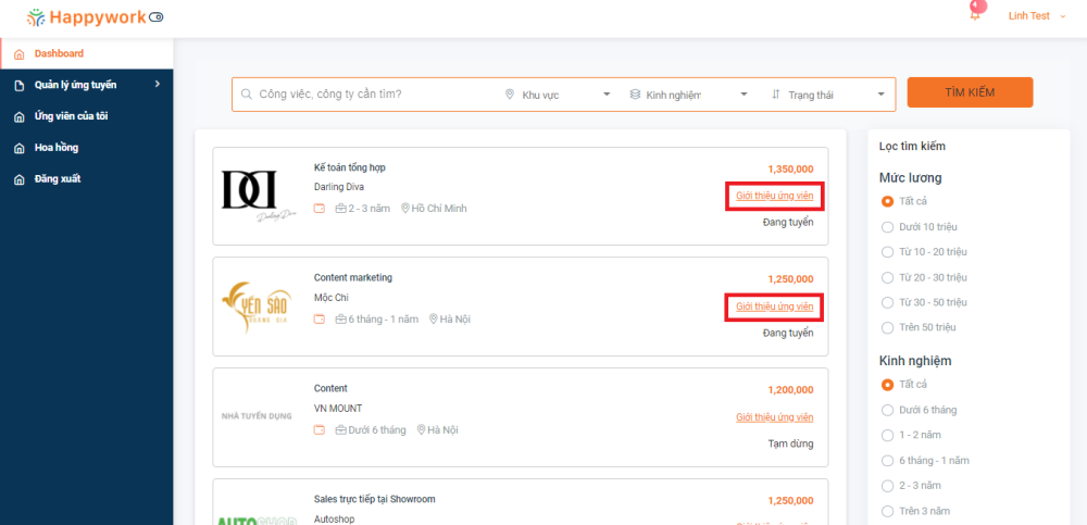 Cách 1: Bạn click vào "Giới thiệu ứng viên" ngay tại màn hình Dashboard