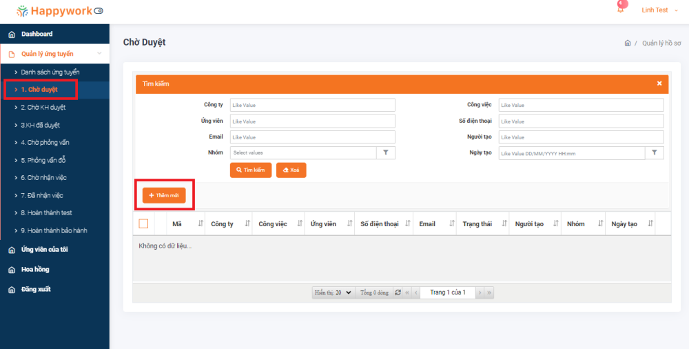 Click “Quản lý ứng tuyển” → “Chờ duyệt” → “Thêm mới”